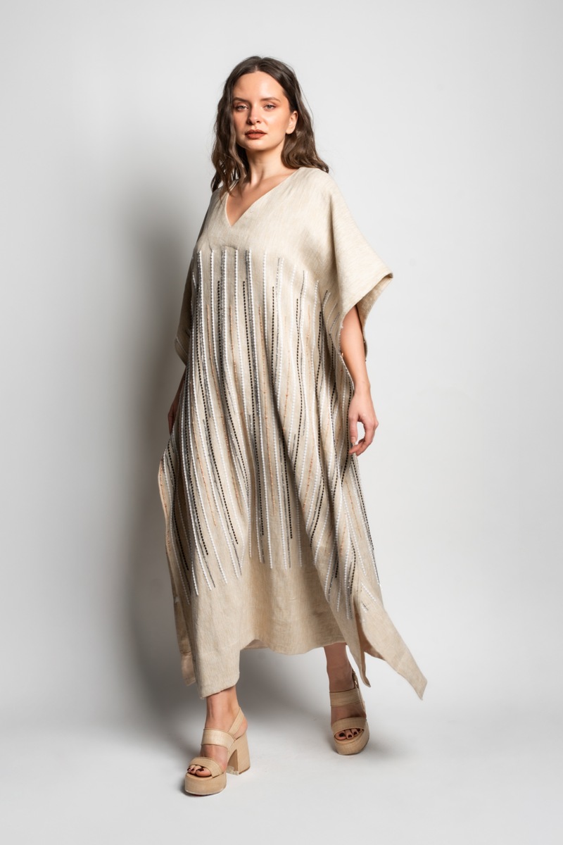Long dress (Tela: beige con rayas negras, plateadas, blancas)