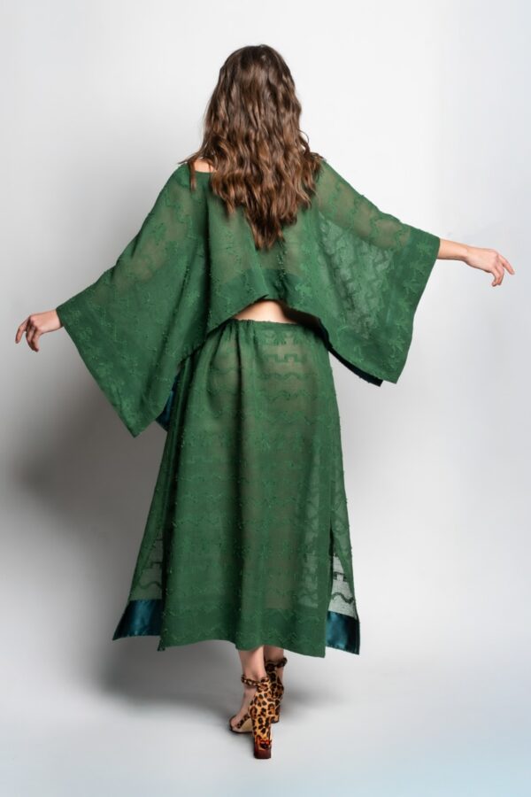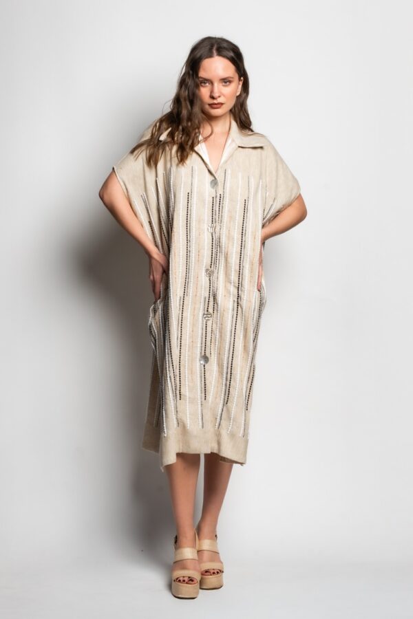 Long dress (Tela: beige con rayas negras, plateadas, blancas)