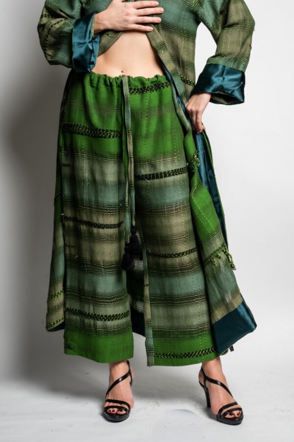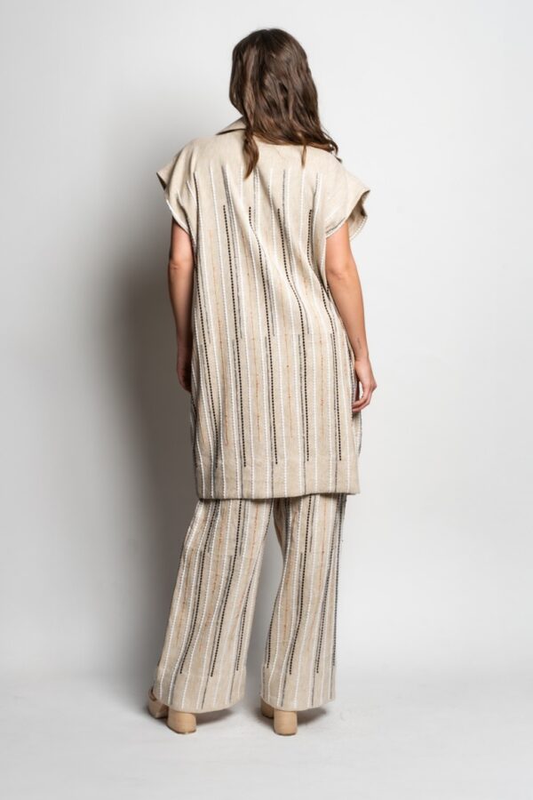 Pants and coat (Tela: beige con rayas negras, plateadas, blancas)